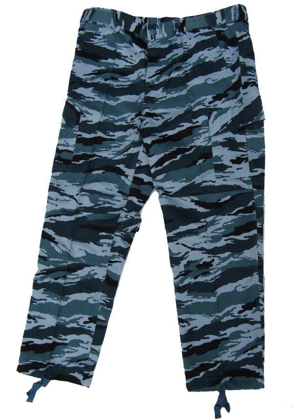 R29C. Russian MVD Blue Tiger Stripe Camouflage. Jacket is zip up with velcro tabs, 2 upper pockets , 1 internal pocket, 2 side zip sleeve pockets. Pants are button fly with 2 front pockets, 2 cargo pockets , velcro pull tabs, 2 velcro pull tabs on each knee.