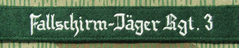 RSE160.Fallschirm-Jager Rgt 3 enlisted ranks cufftitle. Hand embroidered sSilver-Grey thread on Dark Green. $19.95 |