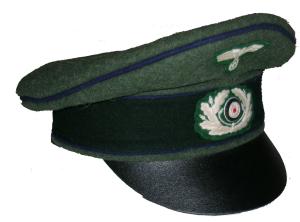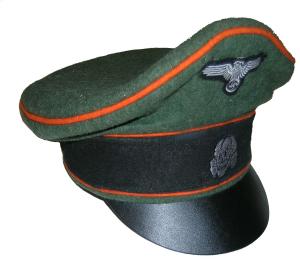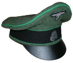 Field gray wool body with Green piping, leather visor, bevo silver cap eagle and cocarde. |