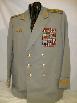 walking out uniform. Jacket,pants,visor.Grey jacket has red piping and gold embroidery on collar and around cuffs,shoulder boards are gold with red underlay and has the large embroidered gold Marshal star with embroidered Soviet coat of arms,large ribbon bar.Pants are dark blue with red generals stripes.Grey visor with red band and red piping with gold embroidery. $1,500 |
