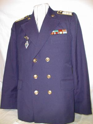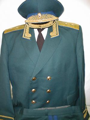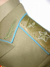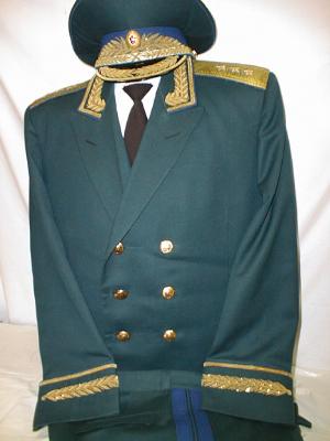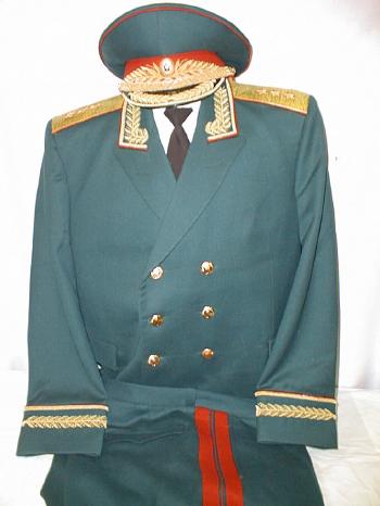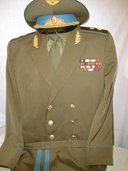 everyday uniform. Complete with jacket,pants,and visor.Jacket has light blue piping and gold embroiderd leaves on collar.Pants have light blue generals stripes.Shoulder boards have embroidered marshal star with gold embroidered wreath and embroidered winged propeller.Size 56-4.$950.00 |