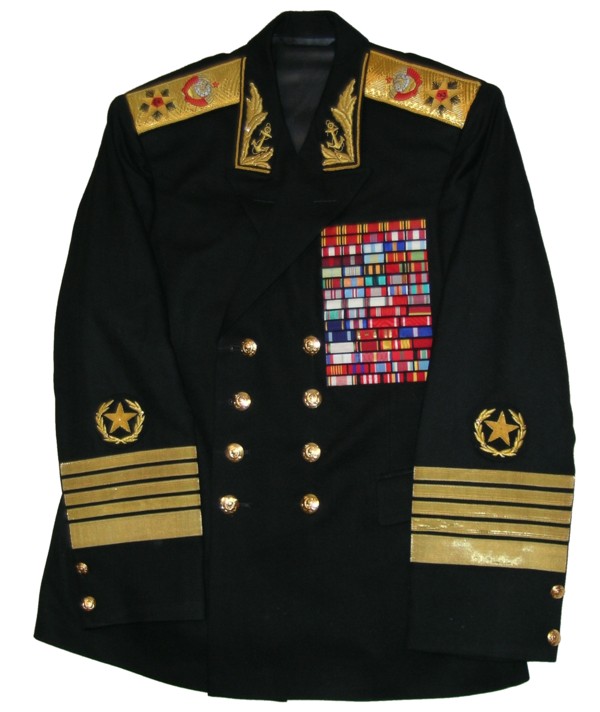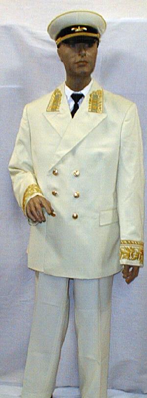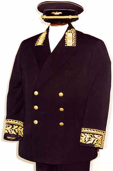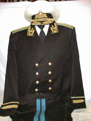 everyday uniform.Jacket, pants,visor.Closed high collar tunic with gold bullion stars on each lower sleeve and Admiral stripes on each sleeve,large ribbon bar.With black pants and visor. |