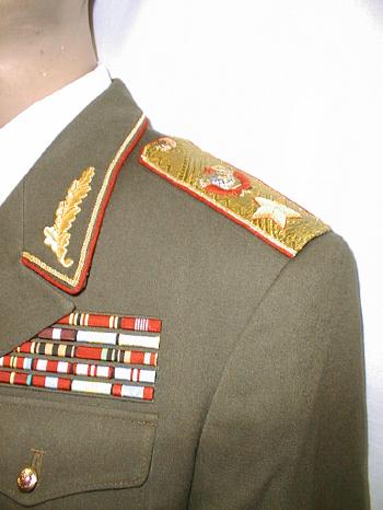 insignia. Shoulder boards have the large embroidered green embroidered Marshal star with embroidered Soviet coat of arms.Breeches are olive with red generals stripes.With visor.ribbon bar.$950.00 |