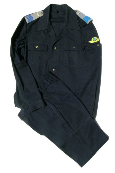 service uniform (jacket, breeches, visor). Jacket is open collar with blue piping around collar and cuffs, subdued plastic buttons, green thread embroidery on collar, large ribbon bar. Shoulder boards are olive wth 1 large embroidered star with blue outline and embroidered winged propeller in green thread. Breeches are olive with blue stripes.General visor is olive color with olive bill and olive chincord, and subdued generals cocarde. About size 58-4. $850.00 |