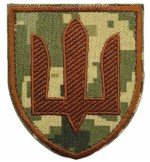 UKW19.Sleeve patch of Armed Forces of Ukraine. General Staff. Black Trident with White outline on MM-14 Pixel camouflage with Black edge. Velcro backing. $12.95