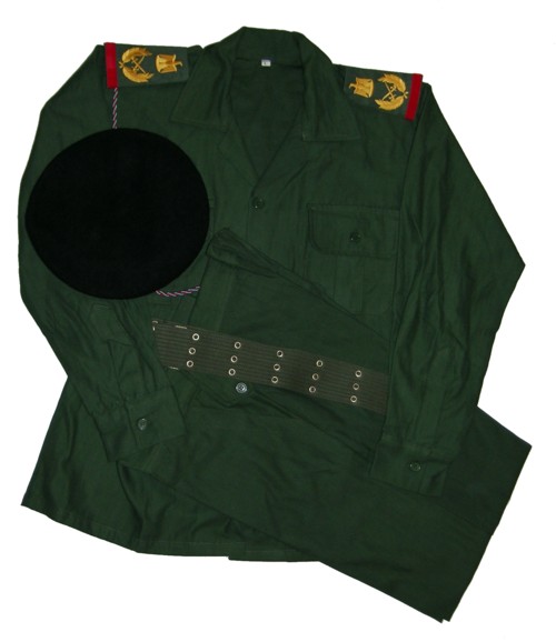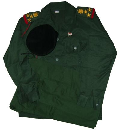 | IU5.Saddam Hussein uniform copy. Iraqi made. Shirt sizes M,L,XL,XXL pants sizes 35,37,40 waist. Comes with Black beret (no badge on this) , Belt. Nice costume. $225.00 |