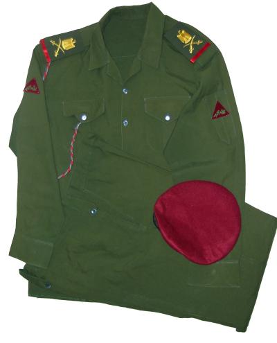 | IU15.Iraqi Army / Republican Guard tan desert color uniform. Jacket and pants. Size XL. Comes with sleeve patches, shoulder cord, beret size 58. Saddam era, Iraqi made. $225.00 |