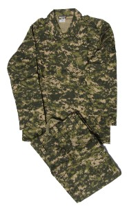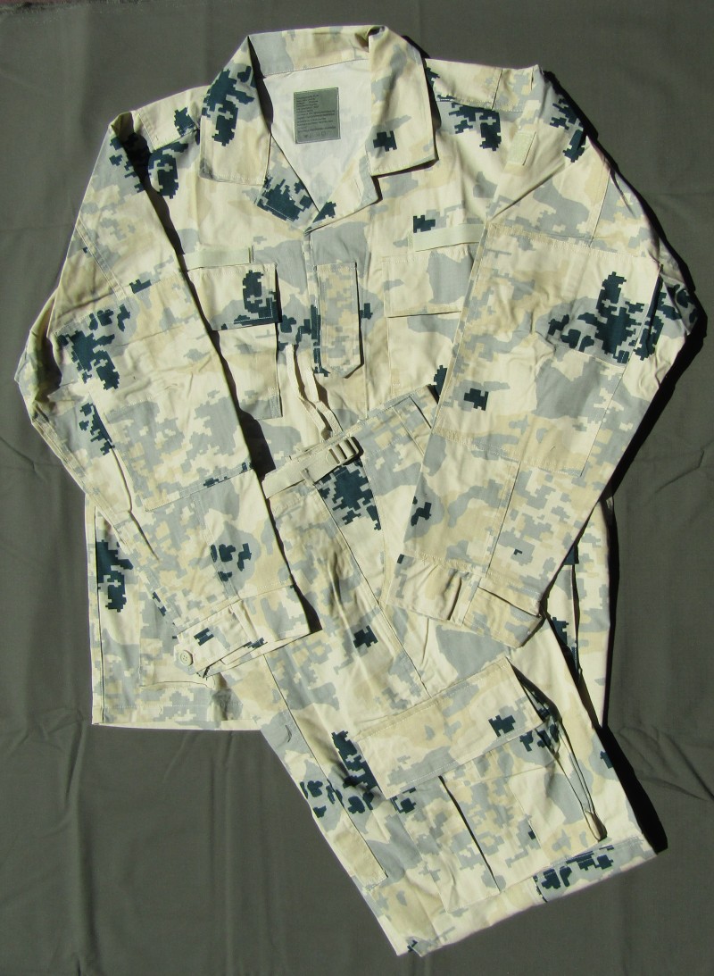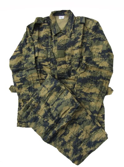 ME3. Digital Urban camouflage set. Shirt is zip up with velcro closure, Collar has pull tab, 2 upper zip close slant  pockets , 2 sleeve zipper pockets. Pants are zip up with button top and have 2 front pockets, 2 zipper close back pockets, 2 zipper close cargo pockets. Maker marked Jungle Front. 100% cotton ripstop. Available in sizes XXL, and XXXL. $119.95