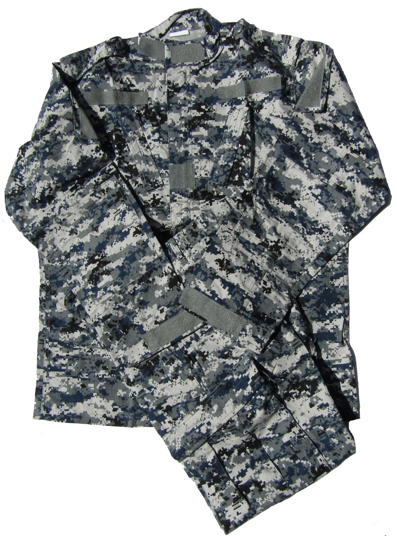 ME1.Middle East Police Blue Urban camouflage set with cap. Shirt is 2 upper pockets with epaulettes. Pants have 2 front pockets and 1 back pocket. Nylon blend. Available in sizes XL and XXL. $99.95