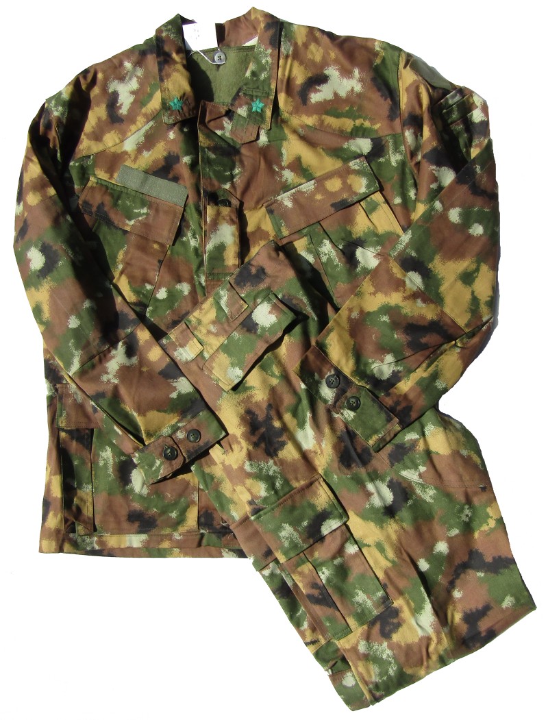 AN1. Angolan Army Leaf pattern camouflage sets. Shirt is button up with 2 front vertical zipper pockets , 2 lower patch pockets. Pants are zip up with 2 front pockets, 2 cargo pockets. Fabric is a twill material. Available in sizes Large and XL . SOLD OUT